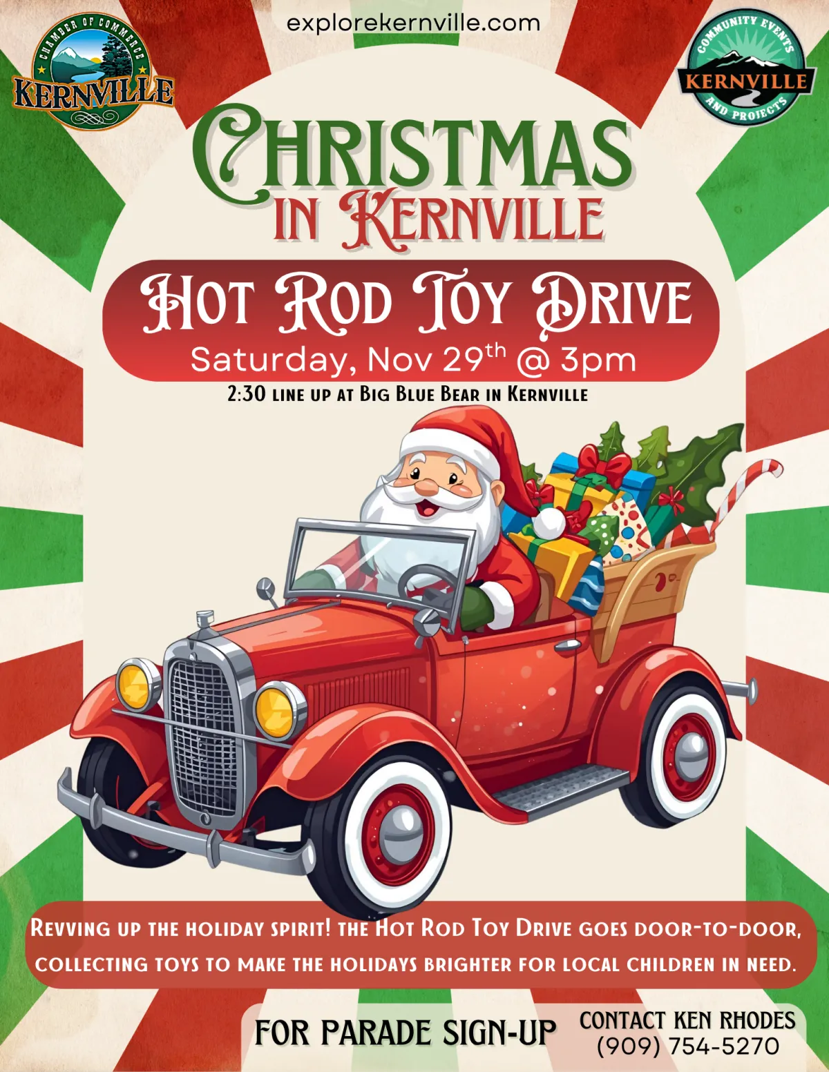 Rev up your holiday spirit and join our community for the Annual Hot Rod Toy Drive, where classic cars and kind hearts come together for a great cause! Bring a new, unwrapped toy to donate and help make Christmas brighter for children right here in the Kern River Valley.