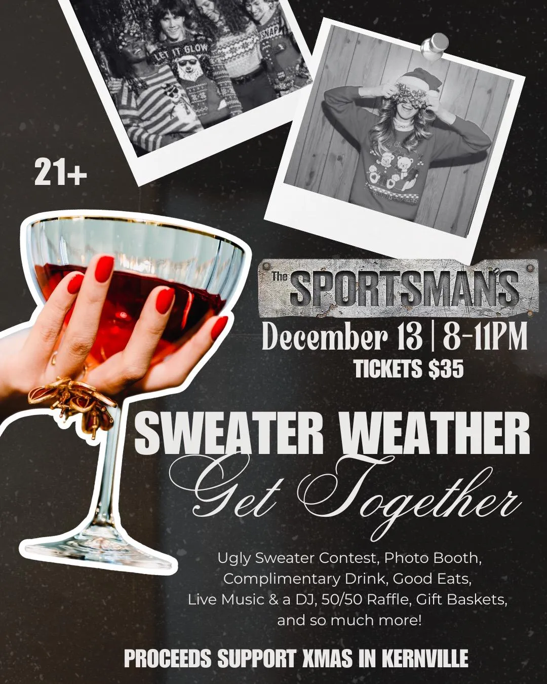 Join us for a cozy, joy-filled night at the Sweater Weather Get Together, happening December 13th from 8-11 PM at The Sportsman in Kernville! Throw on your most outrageous holiday attire and come ready for festive fun, community spirit, and plenty of holiday cheer.